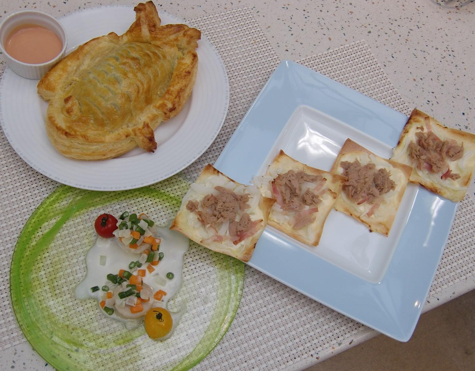 サーモンのパイ包み焼きの照りを出すために卵黄を塗っています。ほたてのクリームにのできあがりです。
